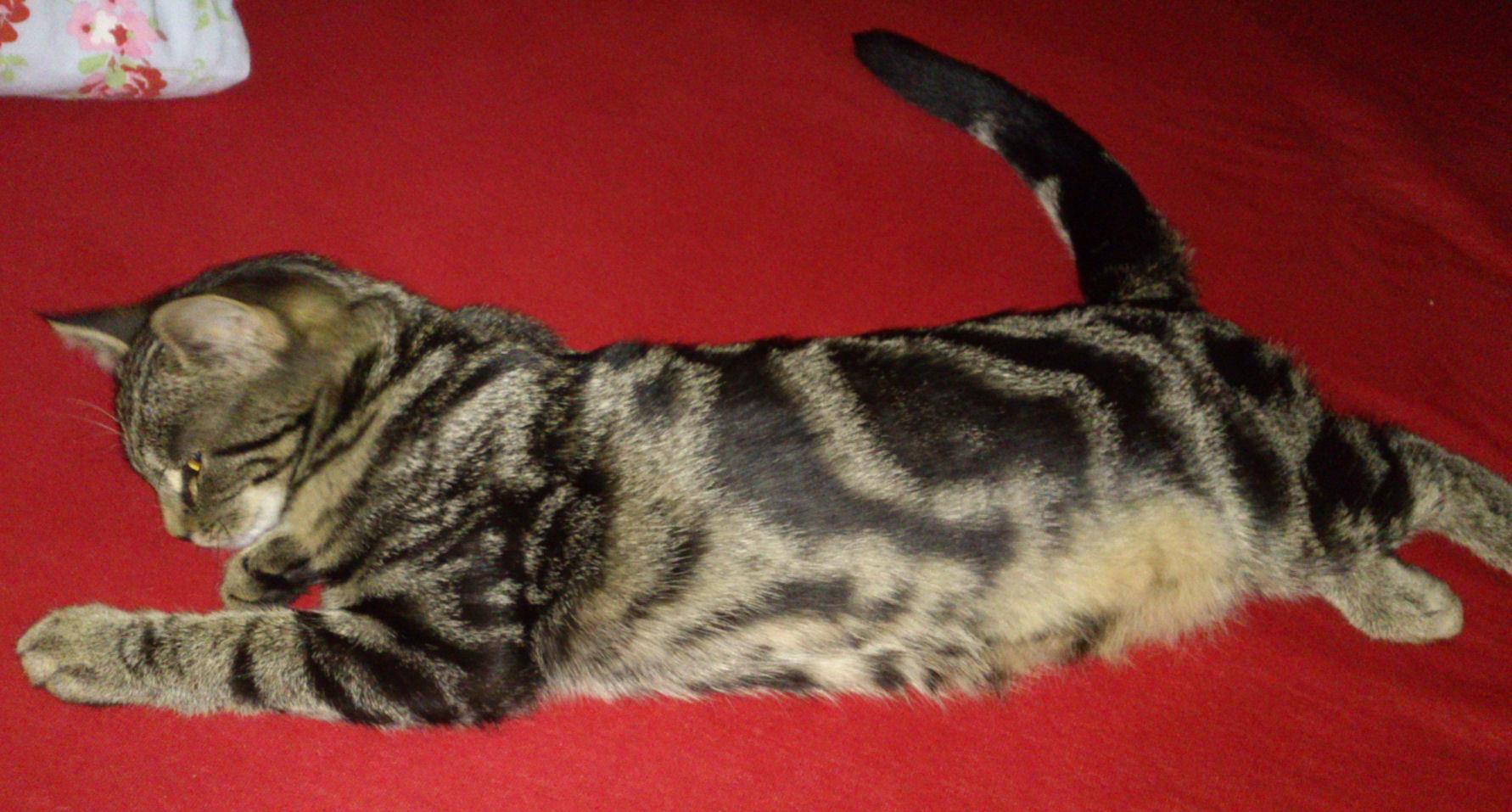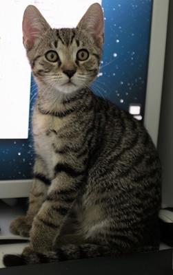 Kater TIGER ist 1 Jahre alt. Sein Fell ist braun getigert, am Bauch und Kinn ist er heller. Er hat einen getigerten Schwanz mit schwarzer Schwanzspitze. TIGER ist Freigänger und Fremden gegenüber sehr zutraulich. Tiger ist jetzt schon älter als auf dem Foto abgebildet.