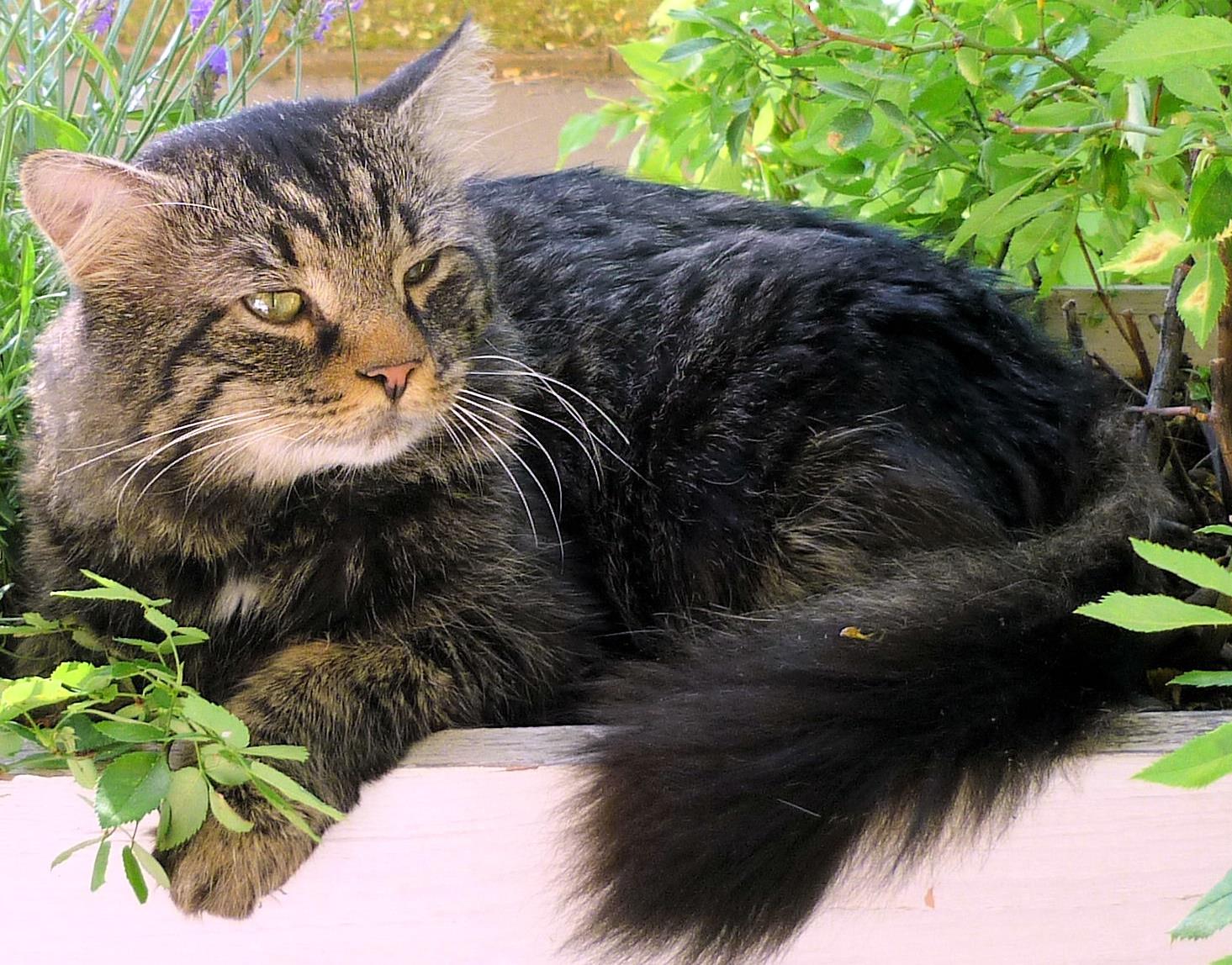 Kater PANNY ist 6 Jahre alt und groß (er wog zuletzt ca. 6 kg). Seine Mutter war eine Perserkatze, daher hat er ein längeres schwarz getigertes Fell und einen buschigen Schwanz. Er hat kleinere Stellen mit weiß (u.a. am Kinn). Er ist Freigänger.