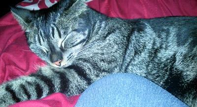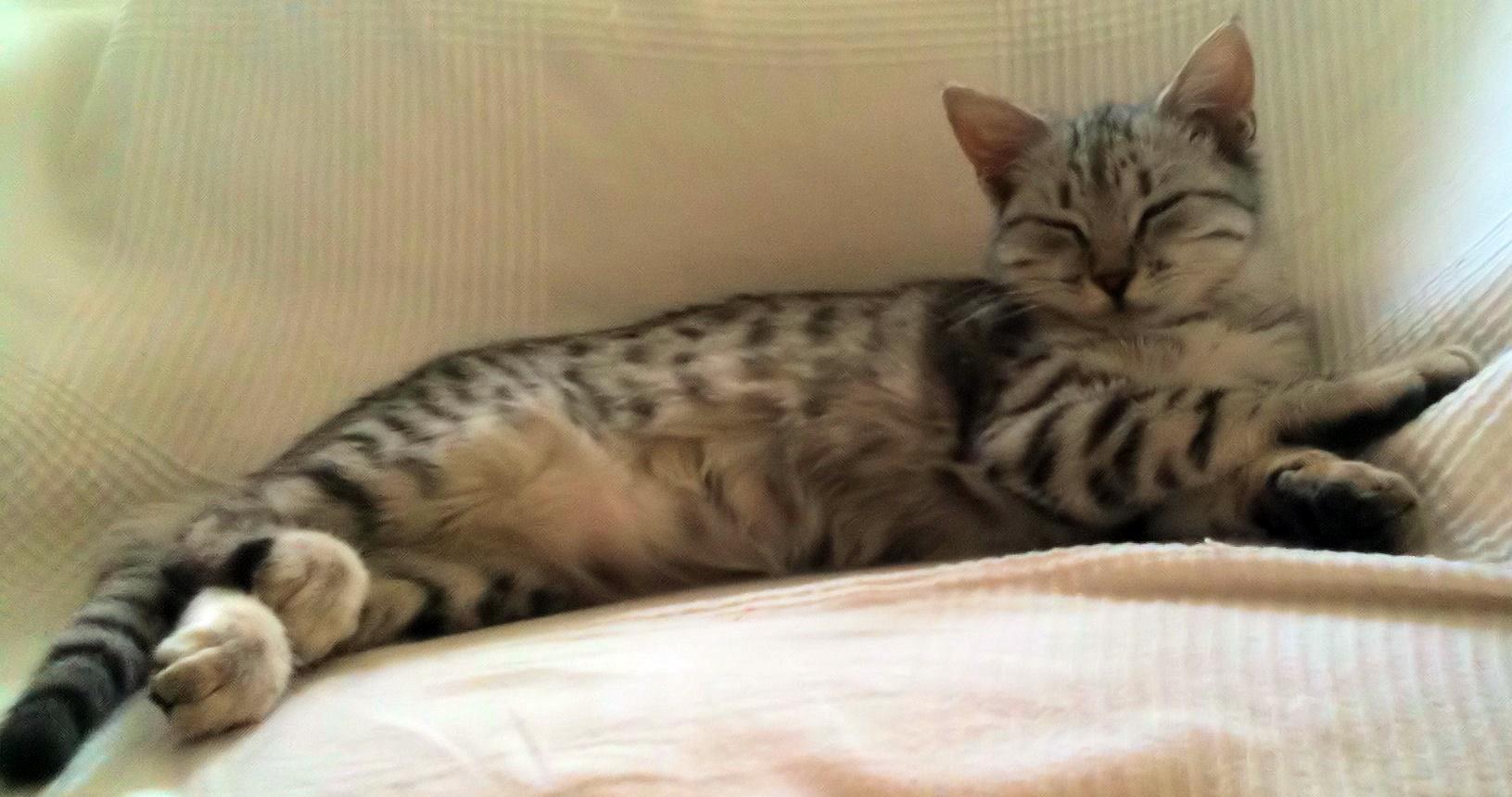 Kater SAMMY ist 1,5 Jahre alt. Sein Fell ist schwarz-grau getigert mit breiten Streifen. Er hat einen ziemlich buschigen Schwanz und große Pfoten. Seine Augenfarbe ist eine Mischaung aus grün/blau/grau. SAMMY ist Freigänger. Er ist schreckhaft und hat Angst vor lauten Geräuschen (Auto, Staubsauger etc.)