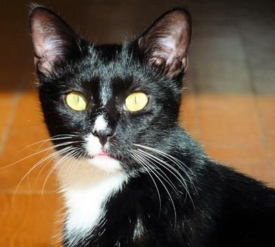 Kater MICKY ist 5 Jahre alt. Sein Fell ist schwarz mit weißem Brustfleck. Er hat eine laute Stimme.