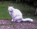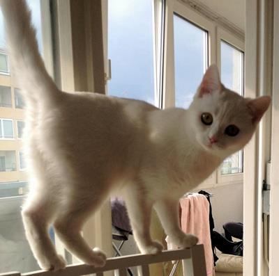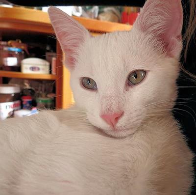 SHIRO ist 1 Jahr alt. Er ist ein Türkish-Van-Mix-Kater mit weißem kurzem Fell. Er hat bernsteinfarbene bzw. braune Augen (das rechte wird zudem nach außen hin etwas bläulich). SHIRO ist Freigänger und Fremden gegenüber eher reserviert.