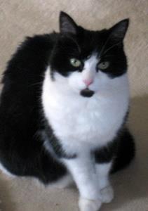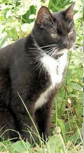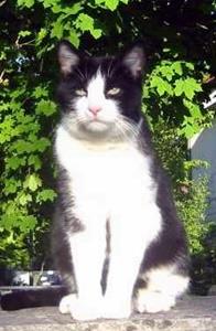 Kater MUCKEL ist 7 Jahre alt. Sein Fell ist schwarz/weiß. Besonderes Erkennungszeichen: Er hat auf der Innenseite der linken Vorderpfote oberhalb des Ballens einen kreisrunden schwarzen Fleck. MUCKEL ist Freigänger. Er ist sehr zutraulich und läßt sich auch von Fremden streicheln.