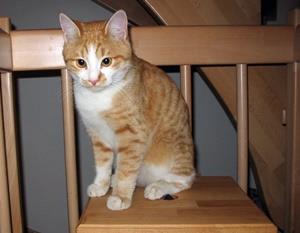 Kater CHARLY ist 13 Jahre alt. Er hat ein rot-weißes Fell mit rotem Rücken, rotem Hinterkopf weißer Brust und weißem (dicken) Bauch. Seine Vorderpfoten sind ebenfalls weiß, die Hinterpfoten rot-weiß. Sein Schwanz ist rot getigert. Sein Gesicht ist um die Mundpartie und zwischen den Augen weiß mit Spitze nach oben. CHARLY ist Freigänger, sehr zutraulich und sehr neugierig. Er steigt auch in Autos.