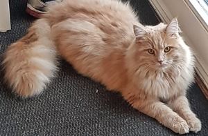 Kater GIZMO ist 1 Jahr alt und ein Maine-Coon-Mix Kater. Er hat ein langes sandfarbenes Fell und einen buschigen Schwanz. GIZMO ist Freigänger und ist Fremden gegenüber sehr zutraulich.