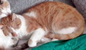 Kater JIMMY ist 2 Jahre alt. Er hat ein rot-weißes Fell mit weißen Pfoten. Er hat einen weißen Nasenrücken mit rötlichen Flecken links und rechts neben der Nase. JIMMY ist Freigänger und Fremden gegenüber eher scheu.