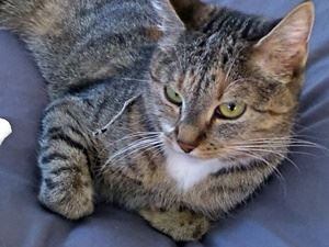 TITI ist 4 Jahre alt. Sie hat ein grau getigertes Fell mit weißer Brust, weißem Bauch und weißen Beinen. Ihr Hinterkopf, Rücken und Schwanz sind getigert. TITI ist Freigängerin und Fremden gegenüber scheu und ängstlich.