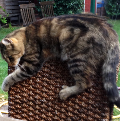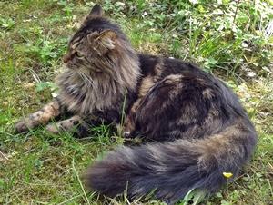 COCO ist 2 Jahre alt eher klein und schmal. Sie ist getigert mit weißer Brust und weißer Blesse auf der Nasenwurzel. Auffällig ist ihr buschiger Schwanz. Sie ist Freigängerin und Fremden gegenüber eher abweisend.