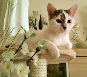 PEACHES ist erst 6 Monate alt. Ihre Fellgrundfarbe ist weiß mit hellgrauen Stellen an Kopf, Schwanz und Hinterpfoten sowie einer auffallenden Zeichnung an Nase und Stirn. PEACHES durfte schon ins Freie. Möglicherweise wurde sie durch Revierkämpfe verscheucht. Sie ist sehr zutraulich.