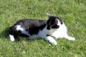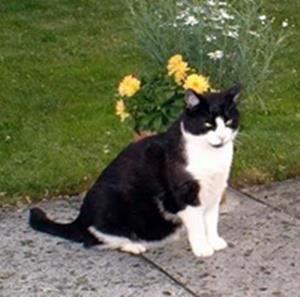 Kater MIKESCH ist 14 Jahre alt. Sein Rücken und Schwanz sind schwarz, sein Bauch und die Beine sind weiß. Am Kinn hat er einen schwarzen Fleck. Er ist herzkrank. MIKESCH ist Freigänger, verläßt aber normalerweise den Garten nicht. Er ist sehr anhänglich, Fremden gegenüber ist er anfänglich recht scheu.