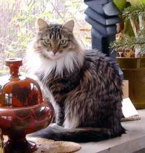 SCHNITZ ist eine 3-jährige sibirische Waldkatze mit etwas längerem Fell. Sie ist grau-braun-weiß getigert mit weißen Pfoten und weißer Brust. SCHNITZ kam von einem nächtlichen Ausflug nicht zurück. Sie ist sehr souverän und mag nicht hochgenommen werden. Sie schmust nur dann, wenn sie es will.