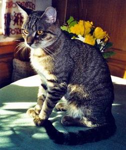 SALLY ist 3 Jahre alt und ist eine braungetigerte Angoramix-Katze mit weißlichem Kinn. Sie hat einen Riß im rechten Ohr.