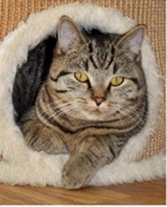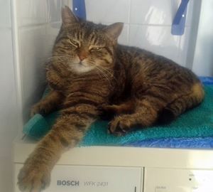 Kater FLOH ist 13 Jahre alt. Sein Fell ist braun getigert mit weißer Schnauze/Kinnbereich. FLOH ist ein reiner Wohnungskater und kennt sich im Freien nicht aus. Er ist aus dem Badfenster gesprungen.