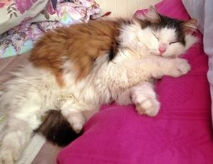 TONTOS ist 9 Jahre alt. Sie ist eine Langhaarkatze in den Farben schwarz, braun und viel weiss. Gesicht, Brust, Bauch, Beine und Pfoten sind komplett weiß, ihr Schwanz ist dunkel und buschig.