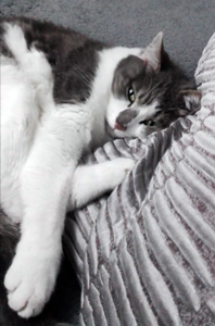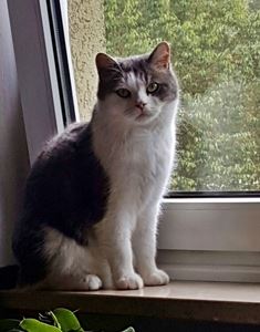 Kater MILO ist 1,5 Jahre alt. Er hat ein schwarz-weißes Fell mit weißen Pfoten sowie einem kleinen schwarzen Fleck auf der Nasenspitze. MILO ist Freigänger und Fremden gegenüber sehr zutraulich.