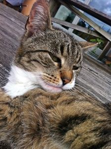 Kater TONI ist 1,5 Jahre alt. Er hat ein braun getigertes Fell mit weißem Kinn. TONI ist Freigänger und auch Fremden gegenüber relativ zutraulich.