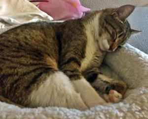 Kätzin SEPPI ist erst 8 Monate alt. Sie hat ein braun-schwarz gerädertes Fell, eine hellere Schnauze/Kinnbereich, eine weiße Brust sowie weiße Pfoten. SEPPI ist Freigängerin und Fremden gegenüber eher scheu.