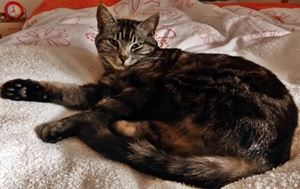 KIRRA ist erst 6 Monate alt. Ihr Fell ist schildpattfarben mit dunklen Stellen im Gesicht und einem hellen rötlich getigerten Schwanz. KIRRA ist tagsüber Freigängerin und Fremden gegenüber eher zurückhaltend.