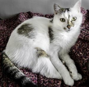 PEACHES ist erst 6 Monate alt. Ihre Fellgrundfarbe ist weiß mit hellgrauen Stellen an Kopf, Schwanz und Hinterpfoten sowie einer auffallenden Zeichnung an Nase und Stirn. PEACHES durfte schon ins Freie. Möglicherweise wurde sie durch Revierkämpfe verscheucht. Sie ist sehr zutraulich.