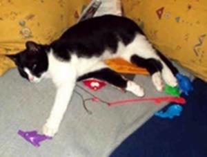 Kater GISMO ist 11 Jahre alt. Er ist recht kräftig. Sein Fell ist schwarz/weiß gemustert. GISMO ist sehr zutraulich. Er trägt ein schwarzes Zeckenband.