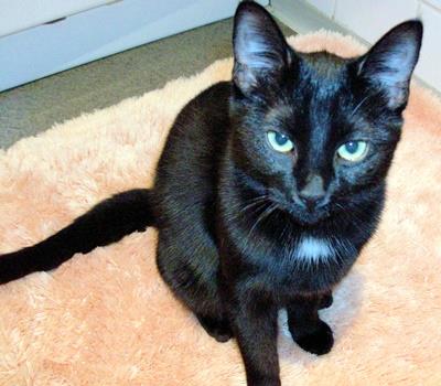 Kater MICKY ist 5 Jahre alt. Sein Fell ist schwarz mit weißem Brustfleck. Er hat eine laute Stimme.