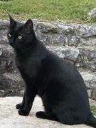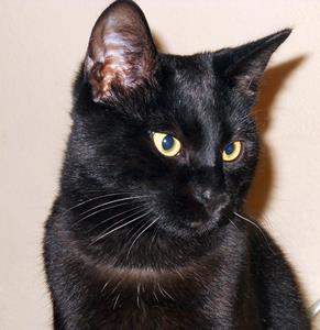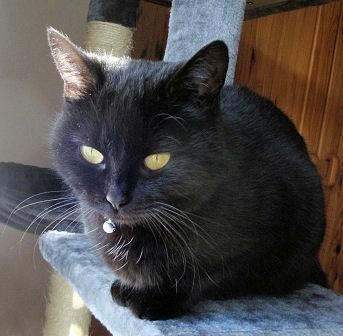SELLISCH ist 9 Jahre alt. Ihr Fell ist schwarz mit einem kleinen weißen Brustfleck und einem weißen Bauch. Sie hat grün-gelbe tropfenförmige Augen. SELLISCH ist eine reine Wohnungskatze und sehr scheu.