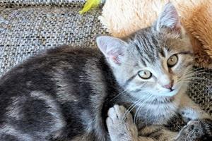 MOMO ist etwa 16 Wochen alt. Ihr Fell ist grau-schwarz gestromt. MOMO ist ganz neu in der Gegend und kennt sich nicht aus.