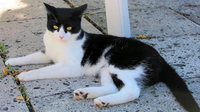 Kater MAXI ist ca. 7 Jahre alt. Er hat ein schwarz-weißes Fell mit auffälligem schwarzem Fleck am Kinn und kräftige Pfoten. Er ist Freigänger.