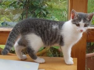 Kater PASCHE ist erst 10 Wochen alt. Sein Fell ist weiß mit grau getigerten Flecken und grauem Fleck auf der Nase. PASCHE war 2 Wochen in der Wohnung und vorher auf einem Bauernhof zuhause. Er ist Fremden gegenüber zunächst scheu, dann interessiert.