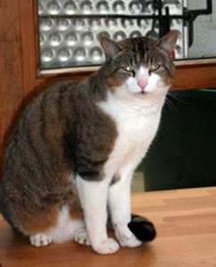 Kater PANNY ist 6 Jahre alt und groß (er wog zuletzt ca. 6 kg). Seine Mutter war eine Perserkatze, daher hat er ein längeres schwarz getigertes Fell und einen buschigen Schwanz. Er hat kleinere Stellen mit weiß (u.a. am Kinn). Er ist Freigänger.