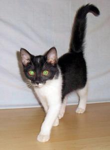 Kater FELIX ist ebenfalls 3-4 Monate alt. Sein Fell ist schwarz-weiß. Hals, Brust, Bauch und Beine sind weiß. Er hat einen schwarzen Schwanz mit weißer Schwanzspitze. Die Fellzeichnung ähnelt der Katze aus der Felix-Werbung.