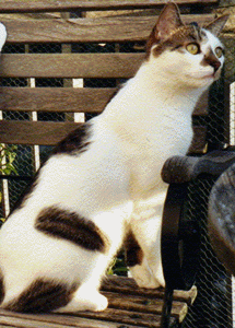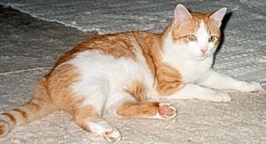 Kater CHARLY ist 13 Jahre alt. Er hat ein rot-weißes Fell mit rotem Rücken, rotem Hinterkopf weißer Brust und weißem (dicken) Bauch. Seine Vorderpfoten sind ebenfalls weiß, die Hinterpfoten rot-weiß. Sein Schwanz ist rot getigert. Sein Gesicht ist um die Mundpartie und zwischen den Augen weiß mit Spitze nach oben. CHARLY ist Freigänger, sehr zutraulich und sehr neugierig. Er steigt auch in Autos.