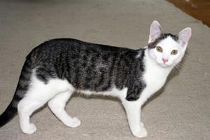 Kater BILLY ist 1 1/2 Jahre alt (das Foto zeigt ihn im Alter von ca. 6 Monaten). Er ist grau getigert mit weißen Beinen, Bauch, Brust und Gesicht. Er hat an der hinteren Pfote eine stecknadelkopfgroße Verletzung, an der kein Fell nachgewachsen ist. BILLY ist zutraulich.