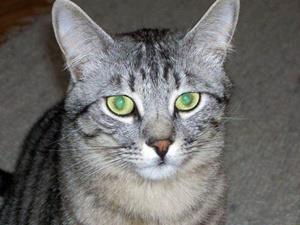Kater RAMBO ist ca. 4 Jahre alt. Sein Fell ist grau/schwarz/weiß getigert. Er hat eine hautfarbene Nase und grüne Augen. Er hat zur Zeit eine kleine zugeheilte Wunde am Schwanz, an der gerade Fell nachwächst (ca. 2 cm lang, 1 cm breit). RAMBO ist Freigänger. Er ist normalerweise sehr scheu, geht nicht zu fremden Menschen und hat Angst vor Lärm.