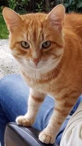 Kater CHICO ist 9 Jahre alt. Er hat ein rot getigertes Fell mit hell umrandeten augen und hellem Schnauzen/Kinnbereich. Er hat am linken Ohr einen kleinen Riss von ca. 2 mm und es fehlen ihm einige Zähne. CHICO ist Freigänger und bei Fremden (besonders bei Männern und Lärm) eher ängstlich, in Ruhe zutraulich.