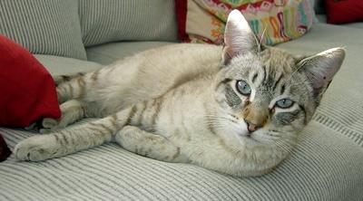 Kater JEDI ist ca. 2 Jahre alt. Er ist ein Siammischling mit cremefarben getigertem Fell, etwas verkürztem Knickschwanz, auffallend blauen Augen, sehr langen Beinen und eleganter Statur. JEDI ist Freigänger und trägt ein graues Zeckenhalsband mit Reflektorstreifen.