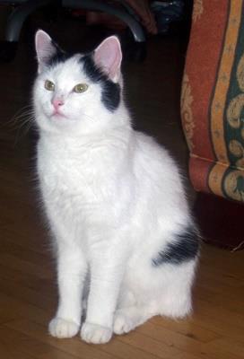 Kater MINOU ist 4 Jahre alt. Sein Fell ist weiß mit einem kleinen schwarzen Fleck am Schwanz und hinter den Ohren. MINOU ist ein reiner Wohnungskater und entkam durch eine offene Wohnungstüre. Er ist sehr zahm.