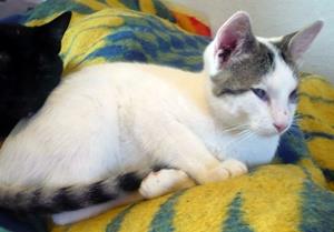 Kater LINGUINI ist ca. 9 Monate alt. Seine Fellgrundfarbe ist weiß mit grau getigerten Stellen und einem grau getigerten Schwanz. Besonderes Kennzeichen: Er hat nur ein Auge. LINGUINI ist Freigänger.