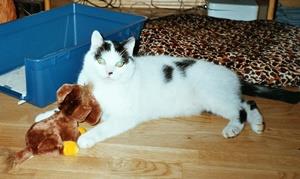Kater BUDDY ist ca. 3 Jahre alt. Er ist weiß mit schwarzen Flecken am Rücken, an den Vorder- und Hinterbeinen, im Kopfbereich und an der Nase. BUDDY ist sehr zutraulich und neugierig.