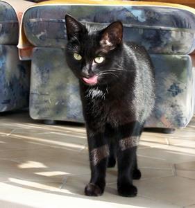 Kater MOHRLE ist 9 Jahre alt. Sein Fell ist komplett schwarz bis auf ein paar weiße Haare auf der Brust. MOHRLE ist Freigänger, aber stark ortsgebunden. Ihm fehlen bereits einige Zähne, darunter auch ein Reißzahn.