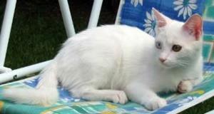 Kater SCHNURRI ist weiß mit getigertem Kopf, Rücken und Schwanz. Er hat auffallend lange Beine und große Ohren.