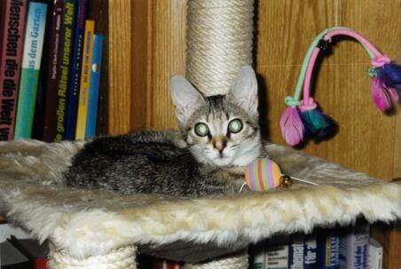 TORA ist eine 1 1/2 jährige Tigerkätzin mit auffallend großen Ohren. Ihre Augen sind schwarz umrandet. Sie ist weder sterilisiert noch tätowiert.
