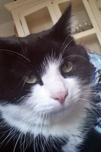 Kater MILO ist 1,5 Jahre alt. Er hat ein schwarz-weißes Fell mit weißen Pfoten sowie einem kleinen schwarzen Fleck auf der Nasenspitze. MILO ist Freigänger und Fremden gegenüber sehr zutraulich.