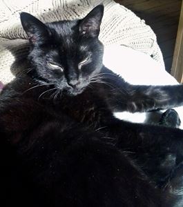 Kater BLACKY ist 1 Jahr alt. Sein Fell ist komplett schwarz. BLACKY ist Freigänger und Fremden gegenüber zutraulich.