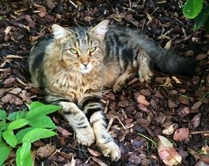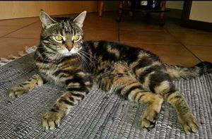 ZOEY ist 6 Jahre alt. Sie hat ein braun-schwarz gerädertes Fell mit weißem Kinnbereich. Sie hat grün-braune Augen. ZOEY ist Freigängerin. Sie ist Fremden gegenüber zutraulich, lässt sich aber nicht hochheben.