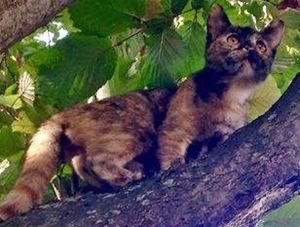 KIRRA ist erst 6 Monate alt. Ihr Fell ist schildpattfarben mit dunklen Stellen im Gesicht und einem hellen rötlich getigerten Schwanz. KIRRA ist tagsüber Freigängerin und Fremden gegenüber eher zurückhaltend.