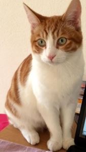 Kater CASPER ist 1 Jahr alt. Er hat ein rot-weißes Fell mit weißen Pfoten. CASPER ist Freigänger und Fremden gegenüber scheu.