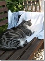 Kätzin SEPPI ist erst 8 Monate alt. Sie hat ein braun-schwarz gerädertes Fell, eine hellere Schnauze/Kinnbereich, eine weiße Brust sowie weiße Pfoten. SEPPI ist Freigängerin und Fremden gegenüber eher scheu.