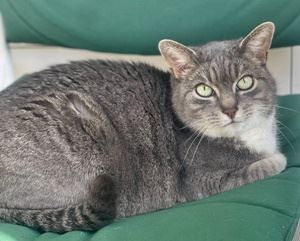SAYA ist 7 Jahre alt. Sie hat ein hellgrau getigertes Fell mit weißer Brust, weißen Pfoten und fast weißem Bauch. SAYA ist eine Wohnungskatze und kennt nur einen eingeschränkten Gartenbereich. Sie ist scheu gegenüber fremden Personen.